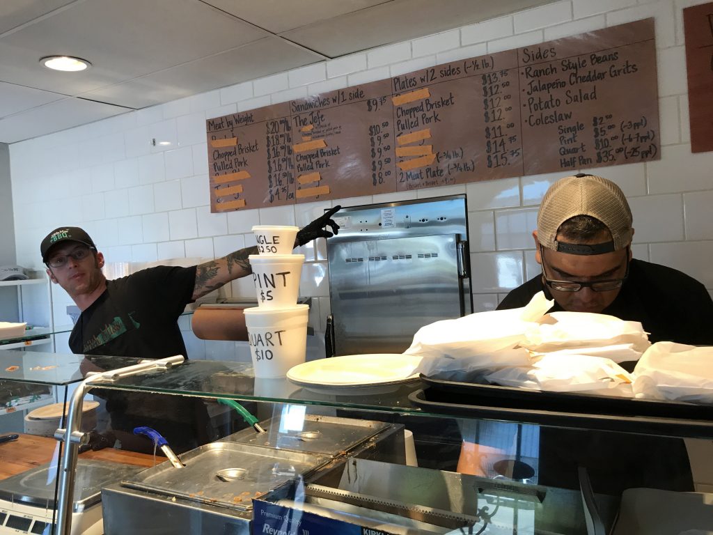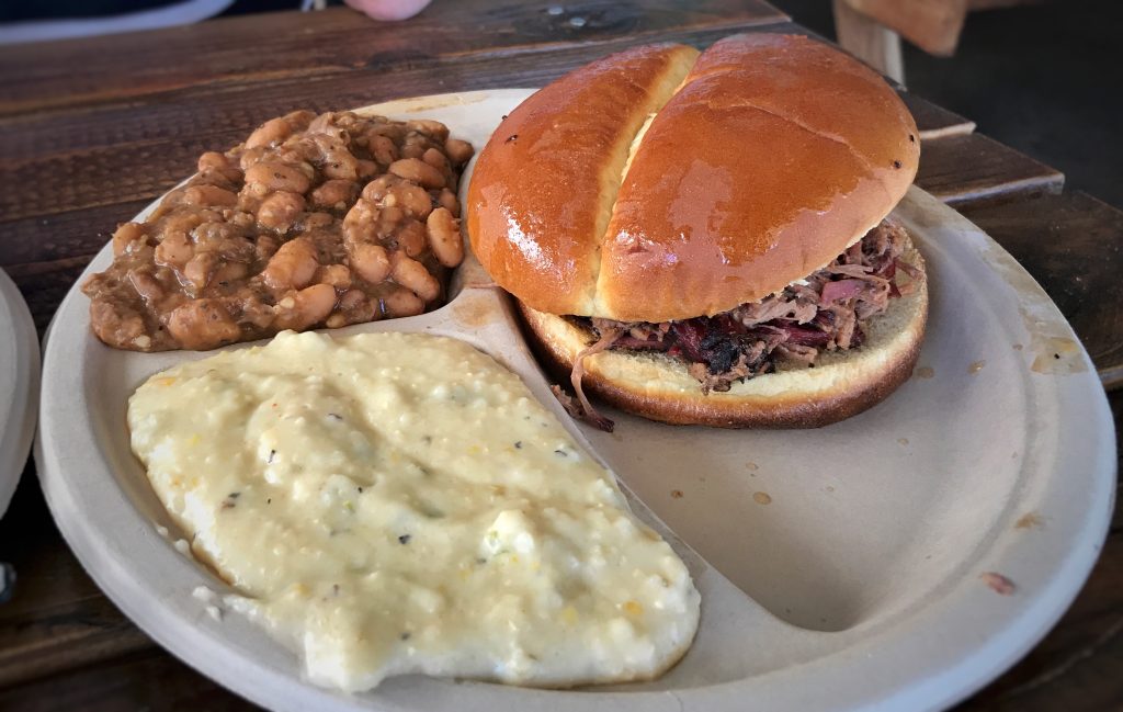 You could make this your strategy, too, but only if you’re willing to be flexible in your order. By the end of the day (they close at 3:00), you get what’s left. In our case, we could only get brisket or pulled pork (which is probably what I would have ordered anyway). The crew also can be really generous with sides at the end of the day, as we found out when Clyde and I debated whether to split barbecue beans or jalapeño grits. The young man behind the counter ended the debate by grinning and giving us both.