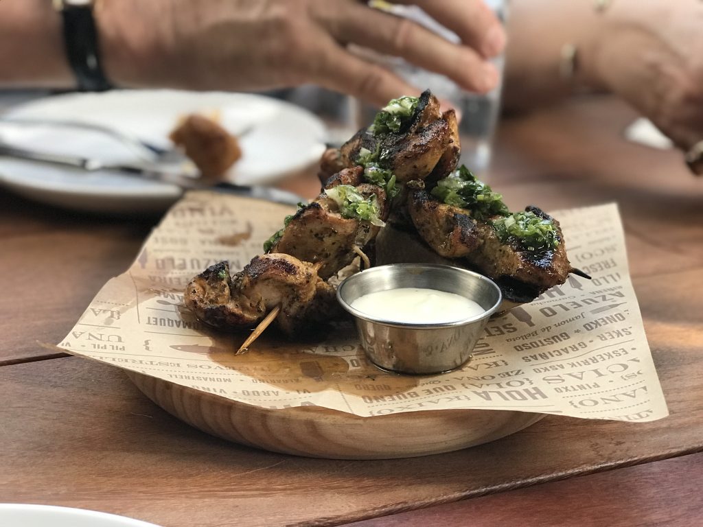 There were pinxtos — in this case, chicken skewers drizzled with green salsa criolla and dipped in yogurt sauce. There were piping hot chicken croquettes, gently spiced with creamy kimchi. There were short ribs: tender meat topped with potato foam, onions, and red wine sauce.