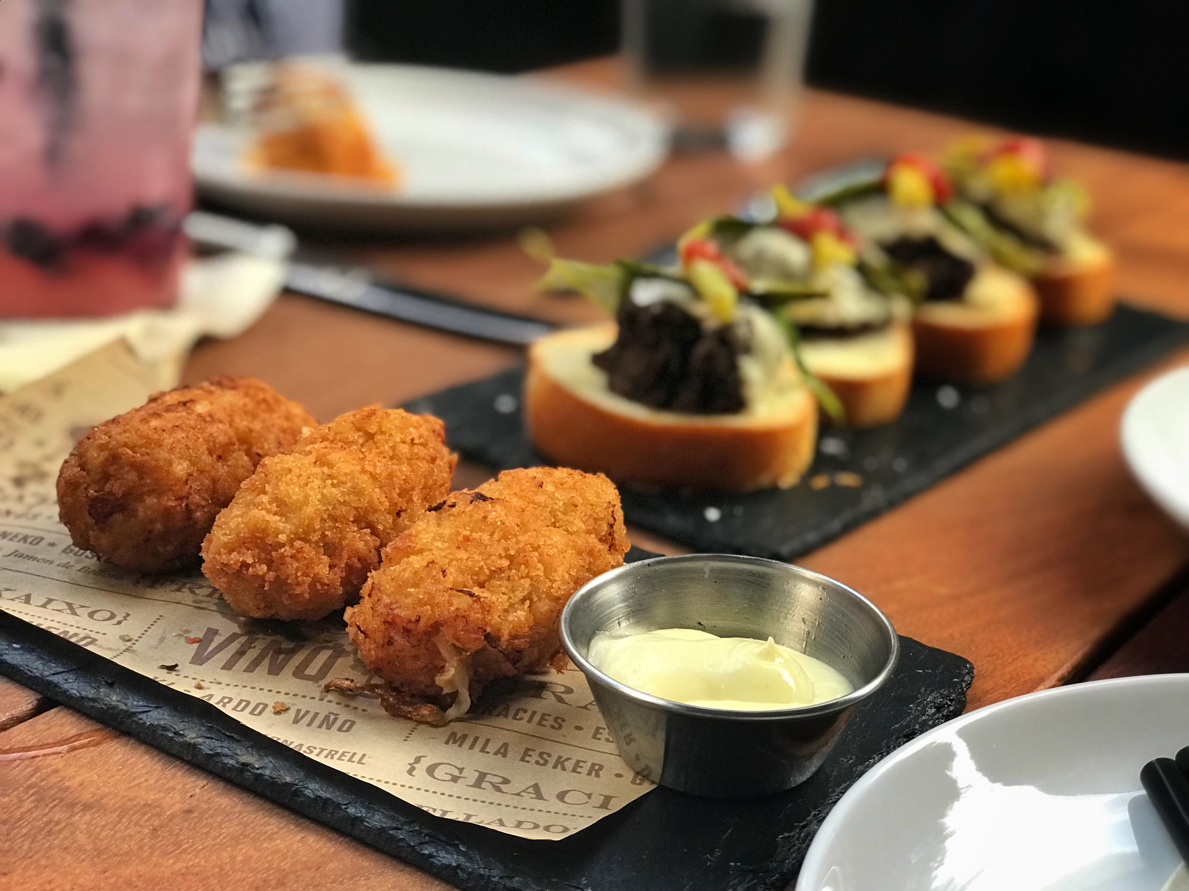 There were pinxtos — in this case, chicken skewers drizzled with green salsa criolla and dipped in yogurt sauce. There were piping hot chicken croquettes, gently spiced with creamy kimchi. There were short ribs: tender meat topped with potato foam, onions, and red wine sauce.
