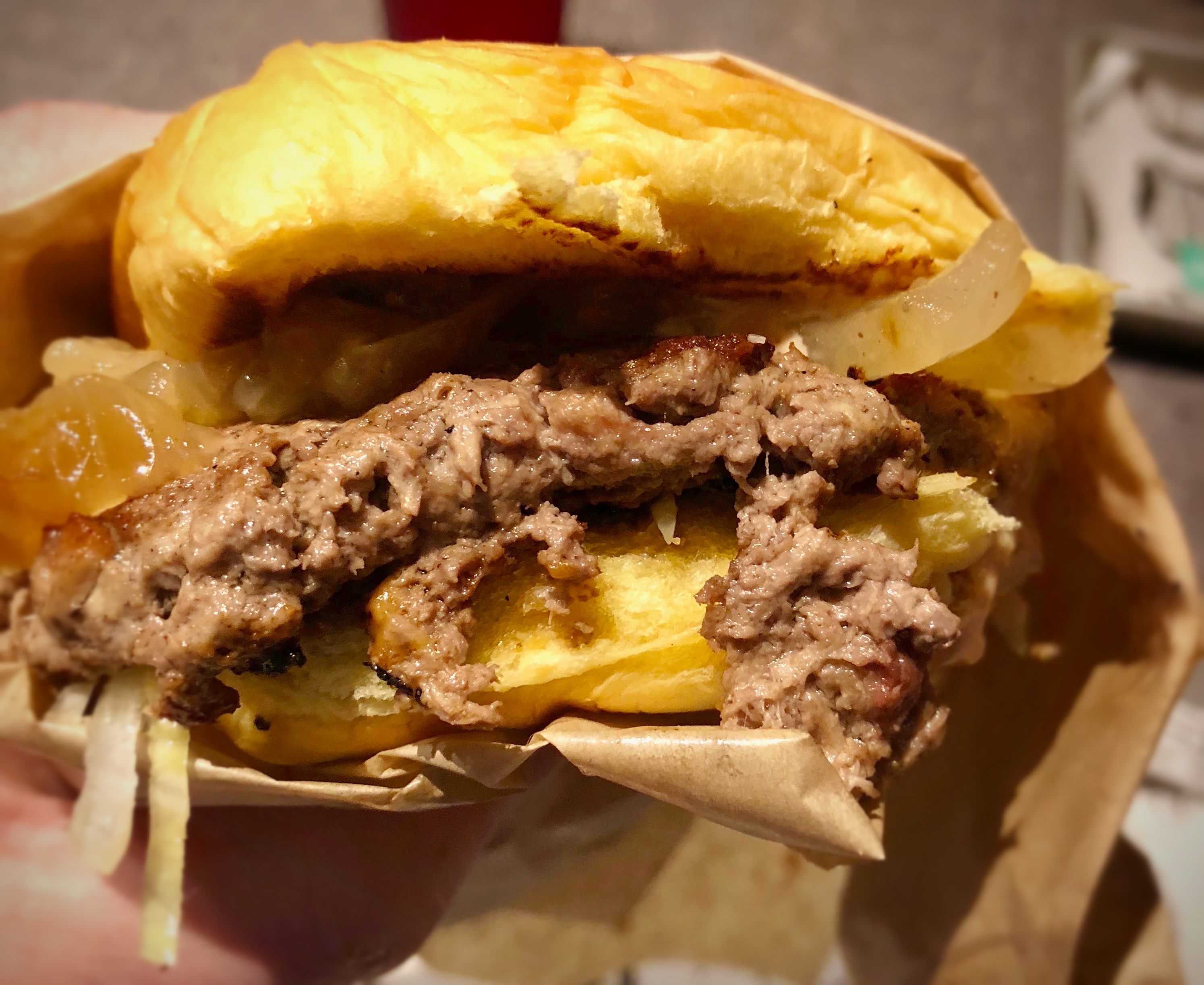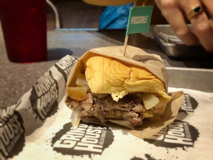 This particular Impossible Burger, enrobed in a steam-soft bun and topped with grilled onions by the good folks at Grindhouse, is a hot, juicy mess of a sandwich. The first flavor notes come from the yeasty bread, followed closely by the caramel and tang of the onions. And then: the “meat” — savory, chewy, with just the right amount of springy resistance between the teeth.